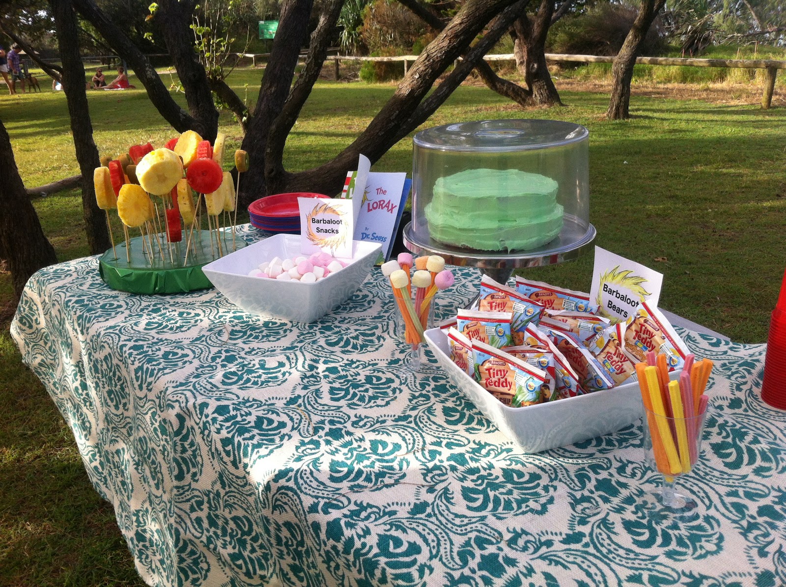 The food table was set up with Barbarloot bears (Tiny Teddies cookies in individual packets), Barbarloot snacks (Marshmallows), Traffula trunks (Musk sticks) and Traffula Trees (fresh pineapple, watermelon and kiwi fruit, cut into circles and mounted on kebab sticks and inserted into a paper covered polystyrene base.